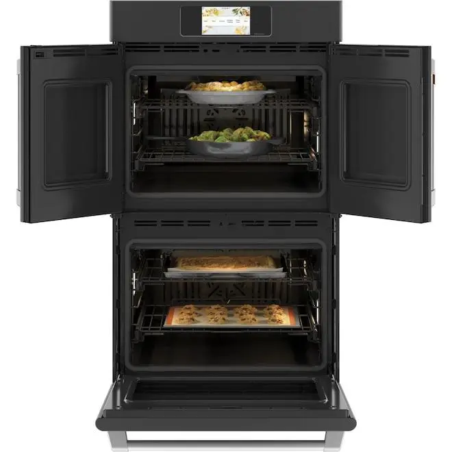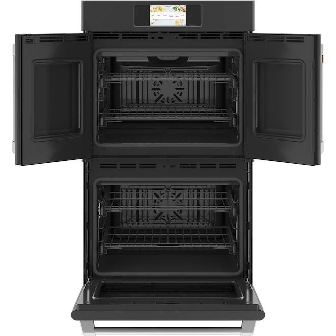 Obtenez tout l’espace désiré avec cet élégant four mural double Café de 30 pouces au fini noir mat. Offrant une capacité totale de 10 pi³, il est muni de portes françaises pratiques s’ouvrant d’une seule main sur le four supérieur. Les deux fours utilisent le système de convection européenne véritable avec air direct vous permettant d’obtenir un rôtissage et une cuisson incroyablement uniformes, et avec les modes de cuisson de précision, vous pouvez essayer de nouvelles recettes en toute confiance et réussir vos préférées. Cet appareil moderne est également muni d’un écran tactile en verre de 7 pouces facile à utiliser et nettoyer, et peut être contrôlé de n’importe où dans la maison avec votre téléphone intelligent pour plus de commodité. Un design professionnel qui prend vie : apportez une sophistication inégalée à votre cuisine avec un four mural à porte double qui respire le professionnalisme et vous permet de personnaliser l’extérieur avec des poignées et des finitions sur mesureConception double de la porte pour un accès plus facile : cuisinez facilement grâce à la conception du four qui vous permet d’ouvrir les deux portes d’une seule main et de placer facilement les aliments à l’intérieurLa précision est le nom de votre jeu de cuisine : essayez en toute confiance de nouvelles recettes et exécutez parfaitement vos recettes préférées, grâce à un système intelligent qui suit automatiquement la progression, modifie les températures et ajuste les temps de cuissonIlluminez la vie dans la cuisine : naviguez facilement dans les réglages du four mural grâce à un superbe écran couleur qui ajoute une touche de style inattendue à votre cuisineLa cuisson parfaite est maintenant parfaitement facile : obtenez des performances inégalées avec le seul système qui offre une convection véritable du haut vers le bas pour des résultats constants lors des occasions spéciales avec les rôtis, le poulet, la dinde et plus encorePas de préchauffage, pas d’ennuis : gagnez du temps grâce à une variété de modes de cuisson de précision qui éliminent le besoin de préchauffageGoût de friture et texture croustillante avec moins d’huile : préparez vos aliments frits préférés de manière saine, grâce à un mode qui croustille sans utiliser d’huile pour la fritureChoisissez une combinaison de finitions haut de gamme et d’options de matériel afin de lui donner une allure qui soit le reflet de votre style personnelProfitez d’un réglage pratique de la température où que vous soyez : préchauffez pendant que vous faites vos courses ou modifiez la température du four pendant que vous travaillez dans le jardin grâce à l’application Cuisine de Cafe Appliances