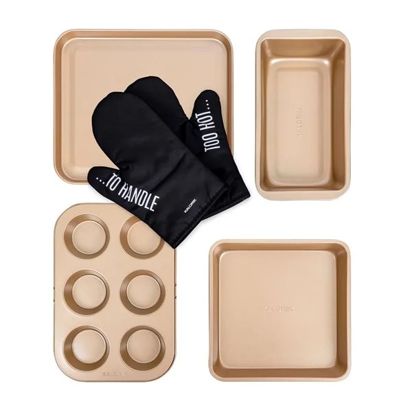 -Inclus: 1 moule à 6 muffins (29 x po 20 po x 2,8 po), 1 plaque à biscuits (29,2 po x 25,4 po x 2,5 po), 1 moule à pain (25,4 po x 12,7 po x 6 po), 1 moule à gâteau (20,3 po x 5,1 po), 2 gants de cuisineL’acier à haute teneur en carbone de qualité professionnelle permet un transfert de chaleur rapide et uniforme pour des résultats de cuisson parfaitsLe revêtement antiadhésif de finition bronze libère facilement les aliments pour un nettoyage rapide et une cuisson sans tracasLes bords roulés très épais sont faciles à saisir et aident les ustensiles de cuisson à conserver leur forme et à résister à la déformationIdéal pour les biscuits, les gâteaux, les muffins, les petits gâteaux, les gâteaux en plaque, les pains, les pâtisseries, les brownies, et bien plus encoreConviens aux friteuses à air chaud, aux fours conventionnels et aux grilloirsFacile à nettoyer