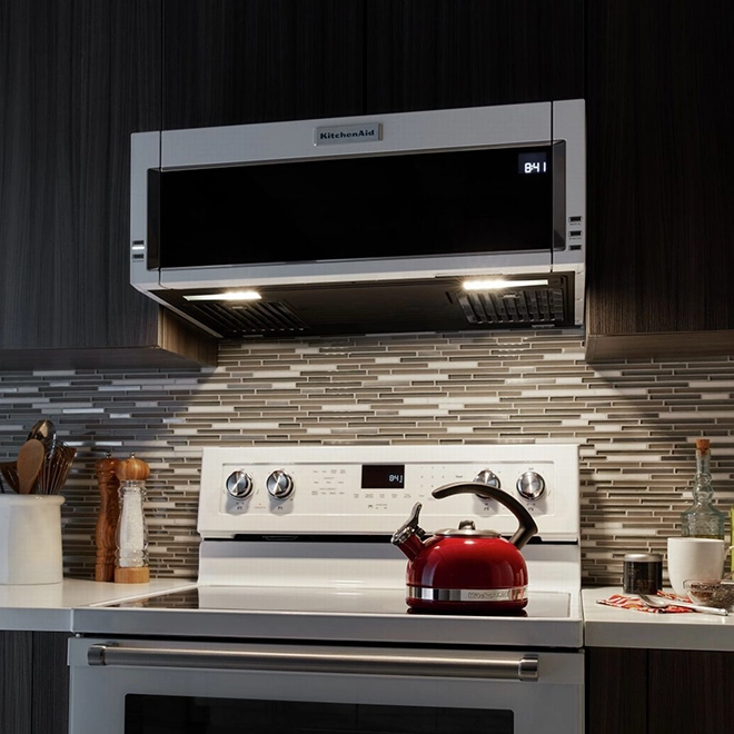 Procurez-vous ce four à micro-ondes KitchenAid blanc pour préparer un large éventail de plats. Son ventilateur double à 5 vitesses offre d’excellentes performances d’évacuation de l’air. Ce four à micro-ondes de 18 pouces est doté d’un clavier de commande à l’intérieur de la porte. Son plateau tournant de 12 pouces offre un espace suffisant pour cuire et réchauffer de manière uniforme. Conception à profil bas. Combine un micro-ondes et une hotte dans l’espace sous l’armoire normalement occupé par une hotte de cuisine seule, avec une hauteur de seulement 10,3 poucesSystème de ventilation Whisper Quiet(MC) : une ventilation discrète et silencieuse qui vous permet de créer sans être distraitVentilation à deux ventilateurs à 5 vitesses. Fournit une ventilation puissante. Deux ventilateurs silencieux à 5 vitesses capturent la fumée, la graisse et les odeurs pour libérer l’air lors de toute aventure culinaire, de la saisie au sautéMoteur de classe 500 PCM. Répond aux exigences de ventilation des techniques de cuisson à haute température comme la saisie à la poêle et le sauté pour que vous puissiez expérimenter en toute confianceDeux lampes de travail DEL. Illuminez toute votre surface de cuisson avec la lumière blanche pure de deux DEL brillantes. Elles vous offrent une excellente vue jusqu’aux coins arrière de la table de cuisson, compte un réglage d’éclairage nocture comme ajout attentionnéBoutons d’alimentation par effleurement en métal qui présentent un style élégant pour les fonctions d’ouverture, d’annulation, de ventilation et d’éclairage sur le devant du micro-ondesLe bouton d’ouverture par effleurement ouvre la porte sur commande d’une simple pression, ce qui permet de l’utiliser facilement avec les mains pleinesCommandes dissimulées du four à micro-ondes : le panneau de commande du four à micro-ondes est dissimulé à l’intérieur de la porte, ce qui lui confère une apparence épuréePuissance de cuisson de 1000 watts : permet de faire bouillir de l’eau, de décongeler des ingrédients ou de réchauffer des restes pour les déguster à nouveau