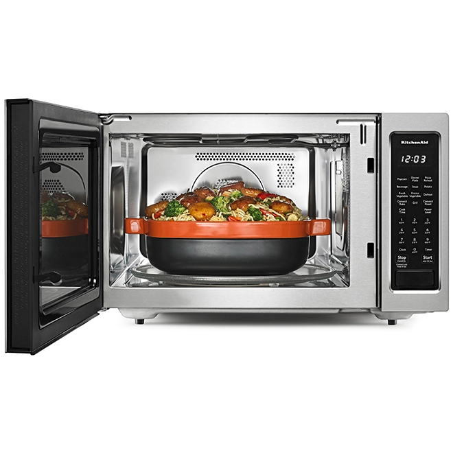 Cuisinez vos plats préférés en un rien de temps avec ce four micro-ondes à convection de KitchenAid(MD). L’élément de convection 1400 W fait circuler la chaleur pour permettre la cuisson par convection à des températures allant jusqu’à 425 °F. La fonction de rôtissage aide à maintenir la répartition de chaleur équilibrée pour un résultat exceptionnel en alternant la cuisson au micro-ondes traditionnelle et la cuisson à convection pour entourer uniformément les aliments de chaleur. La fonction gril permet d’obtenir des résultats similaires à ceux d’un four conventionnel. Une grille fournie avec le micro-ondes chauffe pendant le processus de cuisson pour saisir les viandes et conserver la saveur. Le micro-ondes ajustera automatiquement le temps de cuisson en fonction d’un menu de cycles préprogrammés et pilotés par menus. La plaque tournante encastrée de 13 1/2 » aide à cuire les aliments de manière uniforme en les tournant continuellement tout au long du cycle de cuisson. Le plateau tournant est enfoncé dans le fond du four à micro-ondes afin de maximiser la capacité de 1,5 pi³ suffisamment généreuse pour vous permettre de l’utiliser en complément de votre four conventionnel. Les commandes électroniques avec affichage à DEL rendent le micro-ondes facile à utiliser. Élément de convection de 1400 watts qui fait circuler la chaleur à l’arrière du four pour permettre la cuisson par convection à des températures maximale de 425 °FFonction de rôtissage qui permet de maintenir une répartition équilibrée de la chaleur nécessaire à un rôtissage exceptionnel en alternant la cuisson traditionnelle par micro-ondes et la cuisson par convection pour entourer uniformément les aliments de chaleurFonction de grillage qui permet d’obtenir des grillades similaires à ceux d’un four conventionnel; une grille fournie avec le micro-ondes se réchauffe pendant le processus de grillage pour saisir les viandes et en préserver la saveur6 cycles à commande rapide dont cinq cycles de détection : pour une cuisson exceptionnelle, le micro-ondes ajuste automatiquement le temps de cuisson en fonction d’un menu de cycles préprogrammés, pilotés par menuLe plateau rotatif encastré de 13,5 pouces tourne pour aider les aliments à cuire uniformémentLa capacité de 1,5 pieds cubes est généreuse et vous permet d’utiliser ce four à micro-ondes en complément de votre four conventionnelAccepte un nécessaire de finition de 30 pouces (référence MKC2150AS) ou de 27 pouces (référence MKC2157AS) à installer dans une découpe existanteLes commandes électroniques avec affichage DEL rendent le micro-ondes facile à utiliser et fournissent un affichage qui montre les fonctions en cours de programmationArmoire en acier de couleur assortie qui s’harmonise avec votre cuisine et vos appareils électroménagers
