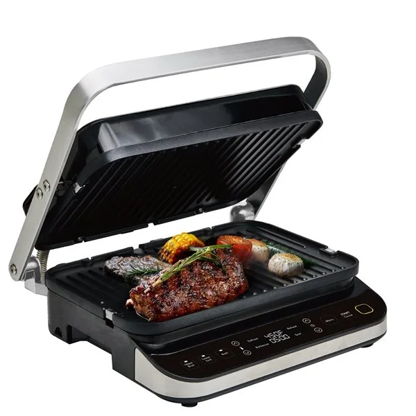 Le gril de contact numérique en acier inoxydable Frigidaire 5-en-1 offre une saveur grillée authentique. Préparez de tout; des classiques du barbecue fumé aux sandwichs grillés de style café, en passant par les favoris sucrés et salés du petit-déjeuner. Les steaks, hamburgers, fruits de mer et légumes se cuisent à merveille sur le gril. Pendant ce temps, la plaque chauffante est idéale pour le bacon, œufs, crêpes et le pain doré. 5 modes de cuisson inclus ; gril de contact, presse à panini, gril complet, plaque chauffante complète et demi-gril/demi-plaque chauffante.La plaque supérieure peut s’ouvrir et s’arrêter à n’importe quel angle entre 30° et 180°Chauffage à double commande4 programmes prédéfinisVa au lave-vaisselleSurface de cuisson recouverte de céramiqueDistribution électrique : chauffage supérieur 800 W ; chauffage inférieure 800 W
