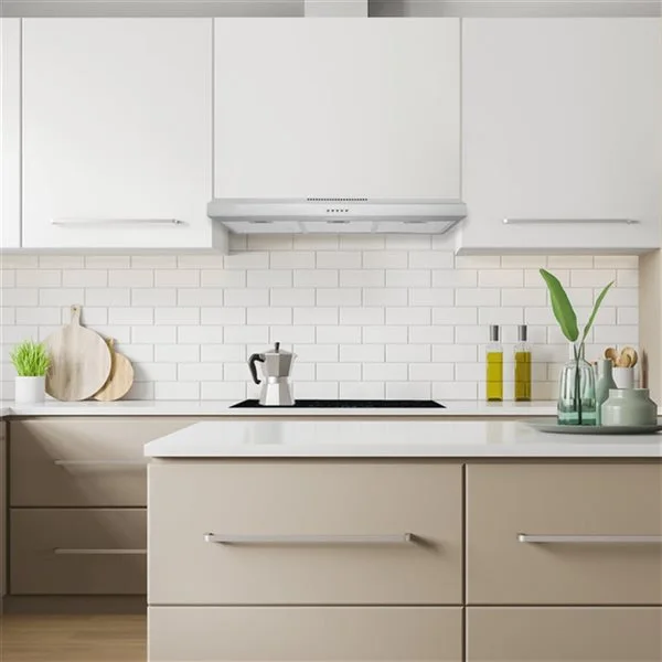 Améliorez facilement la fonctionnalité de votre cuisine avec cette hotte de cuisine sous-armoire. Fabriquée en acier inoxydable de qualité commerciale, cette hotte est dotée de commandes à bouton-poussoir faciles à utiliser, de trois options de vitesse et de filtres résistants au lave-vaisselle qui capturent efficacement la fumée et les odeurs de cuisson.Hotte de cuisine sous-armoire convertible de 36 pouces en acier inoxydable 430 de haute qualitéMoteur d’une capacité de 110 pi³/minute testé de façon indépendante; homologué cETLusPanneau de commande à boutons-pressoirs (trois vitesses) facile à utiliserAmpoule à DEL Pure LightsMC de 2 W conçue par Ancona : puissante, brillante et écoénergétique; affiche une durée de vie jusqu’à 10 fois plus longue que les ampoules traditionnellesFiltres à chicane Clean Filter en acier inoxydable de qualité commerciale permettent de capter encore plus de graisses (lavables au lave-vaisselle)Logo discret afin d’assurer l’homogénéité avec les autres électroménagersÉvacuation arrière ou vers le haut; convertible en unité de recirculation intérieure sans conduit à l’achat d’une trousse de recirculation (non incluse)