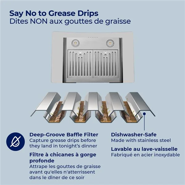 Cette hotte de cuisine Hauslane offre une ventilation exceptionnelle en un seul souffle et grâce à une puissance d’aspiration élevée en PCM. Il ne se contente pas de simplement souffler autour des odeurs désagréables et des odeurs nocives. Au lieu de cela, comme toutes les hottes de cuisine Hauslane, elle extrait rapidement les vapeurs et la fumée et emprisonne la graisse pour une cuisine plus propre et plus fraîche. La performance du ventilateur d’extraction de cette hotte répondra à vos besoins de cuisson, que vous ayez prévu un grand steak pour six personnes ou un simple plat de pâtes pour une personne. Pour un nettoyage facile, essuyez le corps de la hotte et lavez les filtres à chicanes dans le lave-vaisselle.Puissante technologie d’aspiration avec deux moteurs, aspiration puissante soutenue par deux moteurs, idéale pour les cuissons intensives telles que bouillir, cuire à la vapeur, pocher, braiser, frire, saisir et sauterHotte murale à auvent de style européen avec construction en acier inoxydable et finitions en verre trempéLumières à DEL lumineuses et à économie d’énergie avec culot GU10Filtres à chicanes lavables au lave-vaisselle avec des rainures profondes pour retenir les graissesContrôlez la performance en choisissant parmi 3 vitessesPassez en mode sans conduit avec des filtres à charbon (vendus séparément)S’adapte aux cuisines avec des plafonds jusqu’à 10 pieds de haut avec l’ensemble d’extension (vendu séparément)La hotte de cuisine est livrée avec un adaptateur rond de 6 po avec clapets.Garantie limitée de 2 ans et garantie à vie sur les moteurs
