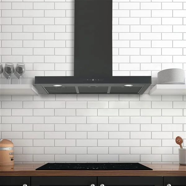 Cette hotte à fixation murale affiche un superbe fini noir mat et des filtres assortis. Son moteur de 440 pi³/min, son dispositif d’arrêt automatique et son panneau de commande tactile à trois vitesses facile à utiliser travaillent de concert pour purifier l’air dans votre cuisine. Procurez-vous la trousse de recyclage d’air (vendue séparément) pour convertir cette hotte en modèle sans conduit.Hotte de cuisine rectangulaire à fixation murale au fini noir mat de 91,44 cm (36 po)Moteur de 440 pi³/min testé par un tiers; homologué cETLusPanneau de commande tactile à trois vitesses muni d’un dispositif d’arrêt automatique différé pour éliminer les odeurs tenacesDeux ampoules à DEL Pure Lights(MC) puissante, brillante et écoénergétique de 1,5 W conçue par Ancona qui affiche une vie utile jusqu’à 10 fois supérieure aux ampoules traditionnellesFiltres Clean Filter(MC) au noyau d’aluminium maillé décoratif qui permettent de capturer encore plus de graisses (lavables au lave-vaisselle).Logo discret afin d’assurer l’homogénéité avec les autres électroménagersÉvacuation vers le haut par évent circulaire de 15,24 cm (6 po)Convertible en hotte à recirculation d’air (sans conduit) à l’achat d’une trousse de filtres de conversion (vendue séparément)