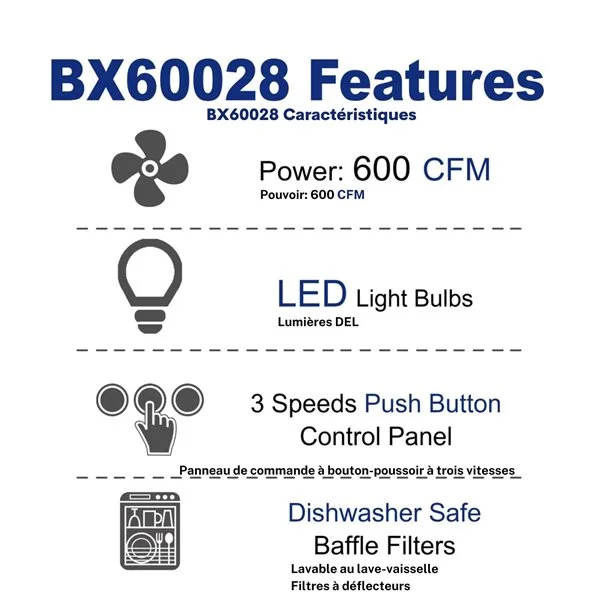Conception discrète permettant de dissimuler la hotte, conférant à l’appareil une apparence impeccable. Hotte puissante et silencieuse au rendement supérieur.Équipé avec des filtres à chicanes en acier inoxydableLumières DELSones: 6 maximum28″Deux ampoules DEL inclusesDessus rond de 6″ seulement
