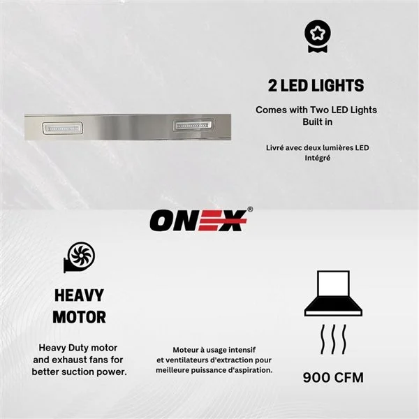 La hotte de cuisine de haute qualité à débit d’air de 900 pi³/min, à ventilateur 3 vitesses, et à moteur puissant, canalisable de 30 pouces ventilera rapidement votre cuisine et maintiendra le niveau de bruit à 52 dB pour vous donner une expérience de cuisson incroyable. La hotte ONEX est équipée de trois filtres à chicanes. Les filtres à chicanes sont faciles à retirer et peuvent être facilement nettoyés au lave-vaisselle. Le panneau à boutons-poussoirs simple le rend facilement accessible à tous. La hotte convient à différentes méthodes de cuisson. Livrée avec 2 ampoules DEL de 2 W pour éclairer davantage votre zone de cuisson. ONEX a simplifié à l’extrême le réglage de la vitesse du ventilateur de manière à agiter simplement la main devant le panneau de commande.PUISSANT, MAIS VRAIMENT SILENCIEUX : hotte de qualité supérieure avec un débit d’air de 900 pcm qui ventile rapidement votre cuisine et maintient le niveau sonore à 52 dB seulementFILTRES À CHICANES : la hotte de cuisinière ONEX(MD) est livrée avec trois filtres à chicanes qui sont faciles à retirer et peuvent être facilement nettoyés au lave-vaissellePANNEAU DE COMMANDE TACTILE : la hotte de cuisine est équipée d’un panneau de commande tactile et lumineux de première qualitéRÉGLAGE DE LA VITESSE PAR UN MOUVEMENT DE LA MAIN : Puisqu’on se salit les mains en cuisinant, il est extrêmement plus facile de régler la vitesse du ventilateur par un simple mouvement de la mainDEUX AMPOULES DEL : la hotte est livrée avec deux ampoules DEL écoénergétiques, sans scintillement, sans éblouissement et écologiques qui s’allument et s’éteignent à partir du panneau de commande à effleurement