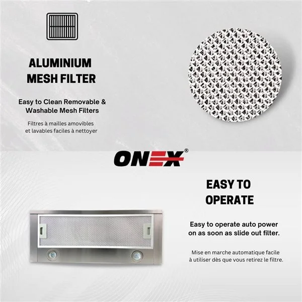 La hotte de cuisine de qualité supérieure avec un débit d’air de 400 pi³/min, un ventilateur à 2 vitesses, un moteur puissant, canalisable de 24 pouces ventilera rapidement votre cuisine et maintiendra le niveau de bruit à 52 dB pour vous offrir une expérience de cuisson incroyable. La hotte ONEX(MD) est équipée de filtres maillés en aluminium. Les filtres maillés en aluminium sont faciles à enlever et peuvent être facilement nettoyés au lave-vaisselle. Le panneau de commande tactile facile à utiliser est accessible à tous. La hotte est adaptée à différentes méthodes de cuisson. Livrée avec 2 ampoules à DEL de 2 W pour éclairer davantage votre zone de cuisson.PUISSANT, MAIS VRAIMENT SILENCIEUX : hotte de qualité supérieure avec un débit d’air de 400 pcm qui ventile rapidement votre cuisine et maintient le niveau sonore à 52 dB seulementFiltre à chicanes lavables au lave-vaisselle : la hotte de cuisine ONEX(MD) est livrée avec des filtres à chicanes faciles à retirer qui peuvent être aisément lavés au le lave-vaissellePANNEAU DE COMMANDE À BOUTONS-POUSSOIRS : le panneau de commande à boutons-poussoirs simples le rend accessible à tous.DEUX AMPOULES DEL : la hotte est livrée avec deux ampoules DEL écoénergétiques, sans scintillement, sans éblouissement et écologiques