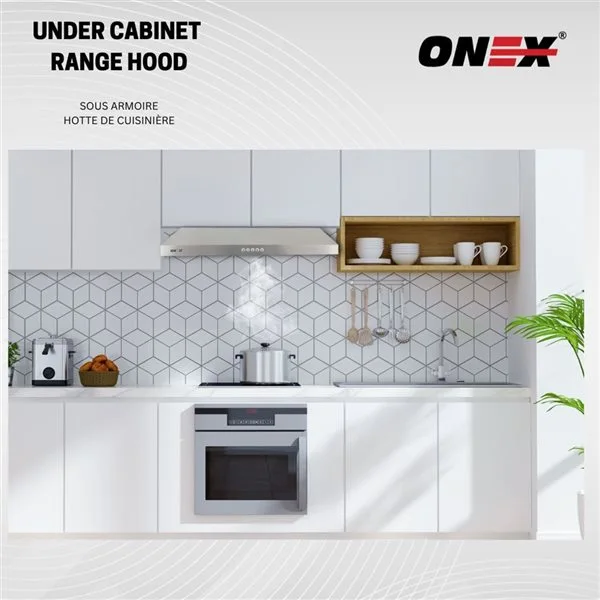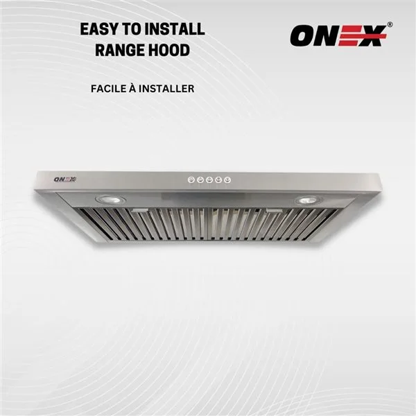 La hotte de cuisine de qualité supérieure avec un débit d’air de 450 pi³/min, un ventilateur à 3 vitesses, un moteur puissant, canalisable de 30 pouces ventilera rapidement votre cuisine et maintiendra le niveau de bruit à 52 dB pour vous offrir une expérience de cuisson incroyable. La hotte ONEX(MD) est équipée de deux filtres à chicanes. Les filtres à chicanes sont faciles à enlever et peuvent être facilement lavés au lave-vaisselle. Le panneau de commande tactile simple est accessible à tous. La hotte est adaptée à différentes méthodes de cuisson. Livré avec 2 ampoules à DEL de 2 W pour éclairer davantage votre zone de cuisson.PUISSANT, MAIS VRAIMENT SILENCIEUX : hotte de qualité supérieure avec un débit d’air de 450 pcm qui ventile rapidement votre cuisine et maintient le niveau sonore à 52 dB seulementFiltre à chicanes lavables au lave-vaisselle : la hotte de cuisine ONEX(MD) est livrée avec des filtres à chicanes faciles à retirer qui peuvent être aisément lavés au le lave-vaissellePANNEAU DE COMMANDE À BOUTONS-POUSSOIRS : le panneau de commande à boutons-poussoirs simples le rend accessible à tous.DEUX AMPOULES DEL : la hotte est livrée avec deux ampoules DEL écoénergétiques, sans scintillement, sans éblouissement et écologiques