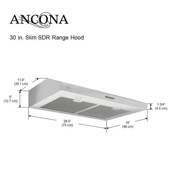 Élégante et compacte, la hotte de cuisine Slim SDR de 30 po d’Ancona a été conçue en acier inoxydable 430 de haute qualité. Proposant 3 vitesses, cette hotte saura transformer votre cuisine et chassera les odeurs de cuisson, la fumée et la vapeur en un temps record. Cette hotte propose trois types de ventilation soit à l’arrière, à la verticale ou à l’horizontale et peut remplacer n’importe quelles hottes standards de 5 po de hauteur.Hotte à montage sous l’armoire de 30 po.325 pi³/min selon les tests indépendants2 lampes halogènes 35WFiltres de charbon inclusVentilation extérieure comprise, recirculation intérieure de l’air possible à l’achat de kit de recirculation vendu séparément.Convient à une armoire et remplace les hottes standards d’au moins 5 po de hauteur.170 W /120 V60 Hz / 0.96 AHomologué cETLus