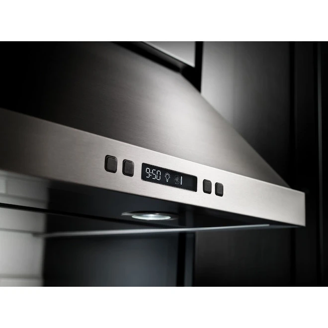 Ne lésinez jamais sur la qualité de l’air de votre cuisine! Cette hotte de cuisine haut de gamme de KitchenAid aspire un impressionnant débit d’air maximal de 600 PCM pour veiller à ce que l’air reste propre et frais pendant que vous cuisinez. Ses 4 vitesses de ventilation peuvent être facilement activées grâce aux commandes tactiles électroniques situées sur l’écran à DEL. Elle est même équipée d’un détecteur de chaleur automatique qui met en marche le ventilateur au plus haut niveau lorsqu’une chaleur excessive est détectée et elle dispose d’une fonction d’arrêt programmable pour plus de commodité. De plus, les lampes de travail DEL offrent la visibilité nécessaire pour préparer tous vos repas comme un pro. D’autres grands avantages : ses filtres à graisses lavables au lave-vaisselle, son système de ventilation silencieux qui émet de 44 dB à 68 dB et sa finition en acier inoxydable. Elle est couverte par une garantie limitée d’un an. La hotte de 30 po au fini élégant en acier inoxydable peut traiter les surfaces de cuisson avec une puissance maximale de 65 000 BTULa ventilation périphérique, avec un débit d’air maximal de 600 pi³/min, aspire efficacement l’air des bords de la hotte et accélère le mouvement de l’air au centre pour garder votre cuisine aéréeLe système Whisper Quiet(MD) délivre 1,3 sones en basse vitesse pour un environnement de cuisson plus paisibleLes commandes électroniques à effleurement à 4 vitesses avec un écran ACL fournissent une confirmation visuelle et élégante de vos sélections de ventilation, de vos réglages et de l’état du filtreLe capteur de chaleur règle automatiquement le ventilateur sur son réglage le plus élevé en cas de chaleur excessive pour que votre cuisine reste fraîche et inodoreLa fonction d’arrêt programmable désactive automatiquement la vitesse du ventilateur après une période donnée, ce qui vous épargne du travailLes lumières DEL fournissent un éclairage supplémentaire au-dessus de la surface de cuisson pour une meilleure visibilité pendant le processus de cuisineLe filtre à graisse lavable au lave-vaisselle réduit la vapeur, la graisse et les odeurs pour éviter tout contact avec les plafonds et les comptoirs (l’ensemble de filtre à charbon pour une installation sans conduit est vendu séparément)S’installe en conduit rond de 6 pouces (vertical) ou sans conduit pour une installation facile (ensemble de recirculation pour une installation sans conduit vendu séparément)