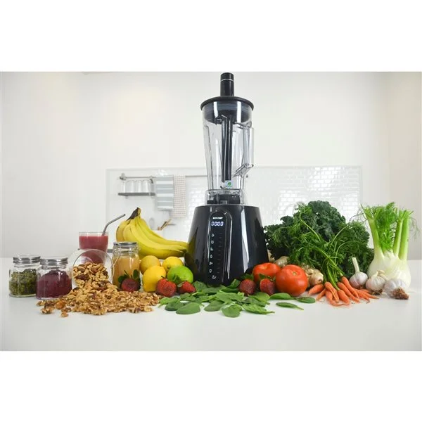 Le mélangeur sous vide noir Living Food utilise une nouvelle technologie de mélange sous vide pour maximiser la nutrition et préserver la fraîcheur en éliminant l’air et donc l’oxygène du bol mélangeur avant le mélange. Cela évite l’oxydation des aliments et se traduit par une durée de conservation plus longue, une qualité et des couleurs plus vives des smoothies. Le mélange sous vide est la dernière technologie de mélange. Le mélangeur est doté de la technologie de protection enzymatique (EPT) pour protéger les enzymes et les nutriments contenus dans les aliments. L’accessoire de mélange sous vide est séparé et vous pouvez donc aspirer ou mélanger normalement. Il se fixe simplement au couvercle du pichet, éliminant l’oxygène du pichet par le haut. Le capteur de pression de vide détecte et s’arrête automatiquement une fois que l’oxygène a été éliminé. Vous pouvez toujours préparer toutes vos soupes et boissons chaudes préférées dans le mélangeur Living Food sans l’accessoire.Nouvelle technologie révolutionnaire de mélange sous vide pour une durée de conservation plus longue, de meilleures couleursSystème de protection d’enzymes (EPT) avec thermomètre DEL sur le bâton poussoirLa technologie de protection enzymatique, capable de mesurer la chaleur générée à l’intérieur du mélangeur pour préserver et protéger les nutriments dans les alimentsLames à 6 dents en acier inoxydable, 4 lames dentelées serrant le bol et 2 petites lames centrales orientées vers le hautMélangeur à haute vitesse avec moteur de 1 680 WattsChoisissez parmi les fonctions soupe, hachez ou mélangez ou utilisez les réglages d’impulsion et de 10 vitesses pour augmenter ou diminuer manuellement la puissance à votre guiseFonction de surcharge automatique et micro-interrupteur de sécurité pour protéger le moteur